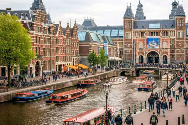 A geographic background of the Dutch capital, focusing on the historic canal rings and the cultural context of its museum district.